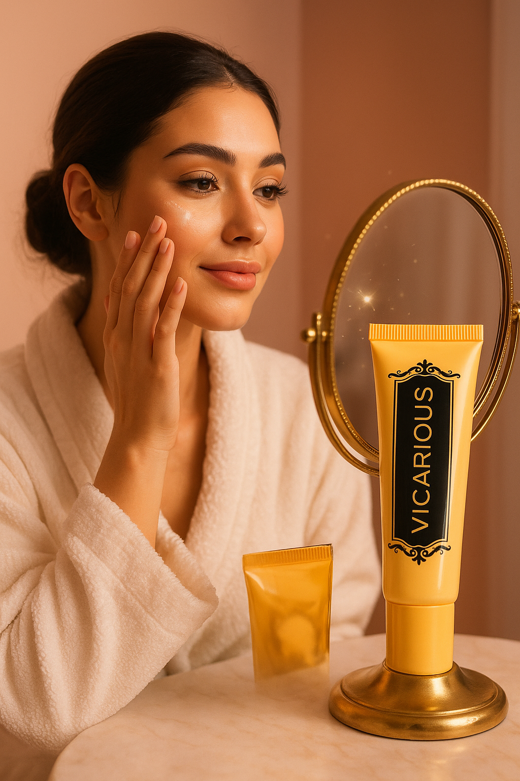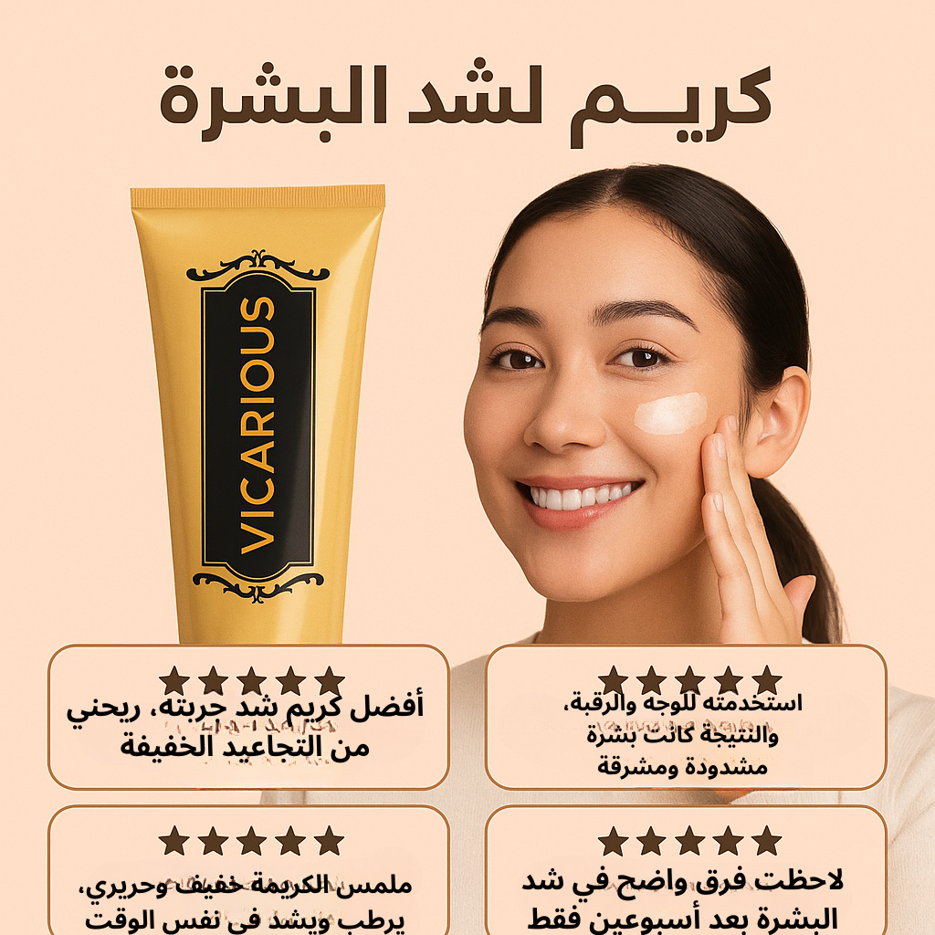 استعيدي مظهر الشباب مع كريم VICARIOUS لشد البشرة، الغني بمركبات الكولاجين والببتيدات ومستخلصات عشبية طبيعية. تركيبة فاخرة بلون ذهبي تعمل على رفع وشد البشرة المترهلة، وتقليل الخطوط الدقيقة، وترطيب البشرة بعمق — مثالي للبشرة الجافة أو المتقدمة بالعمر في أجواء الخليج.